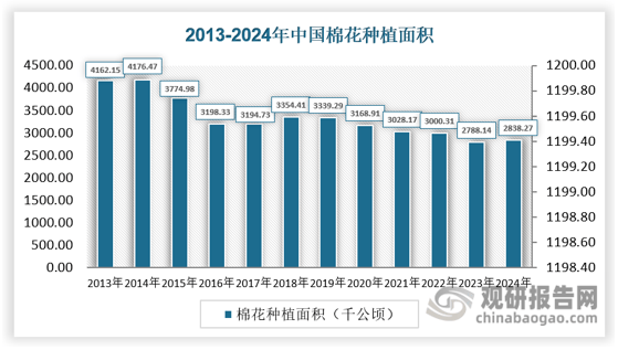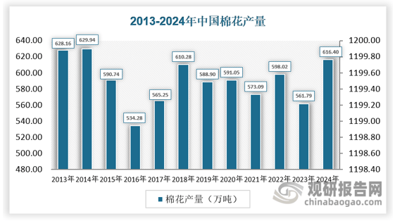 棉花做为世界上最主要的经济做物之一,是纺织业的次要原料,普遍使用于服拆、家纺、财产用纺织品等范畴。棉花财产是我国部门地域农村经济的支柱性财产和农人收入的主要来历。其财产链长、联系关系度高,正在我国国平易近经济中拥有主要地位,是关系国计平易近生的主要计谋物资。世界棉花。我国不只是次要的棉花出产国,也是最主要的棉花消费国和纺织品服拆出口国。近几年,中国棉花产量约占世界的四分之一,棉花消费量占世界的30%,纺织品服拆出口额占世界份额30%以上。出产端、加工端、畅通端、纺织端集体发力,让世界看到了中国棉业成长的加快度。从供应来看,种植面积上,2024年,中国棉花种植面积为2838。27千公顷,同比力2023年的2788。14千公顷添加了50。13千公顷、增幅约为1。8%;取11年前(即2013年的4162。15千公顷)比拟,近11年来削减了1323。88千公顷,产量方面,2024年,中国棉花产量为616。4万吨,同比力2023年的561。79万吨添加了54。61万吨、增幅约为9。72%;取11年前(即2013年的628。16万吨)比拟,近11年来削减了11。76万吨、降幅约1。87%。