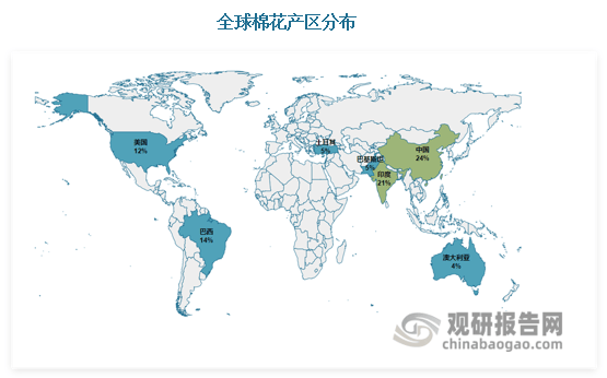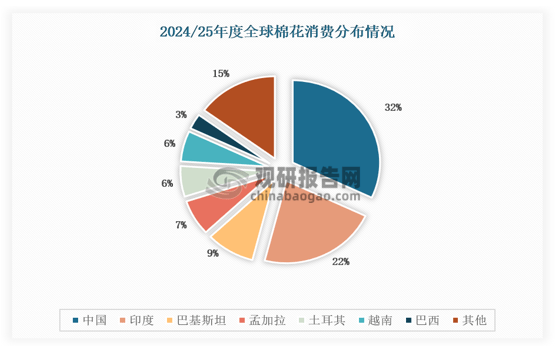 中国、印度、巴基斯坦、孟加拉、土耳其、其消费总量占到了全球的82%。此中中国占比最大,占全球棉花总消费量的近三分之一。
