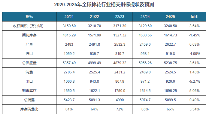 正在棉花消费方面,正在全球需求收缩和预期转弱的大布景下,2024 年国内棉纺织行业运转总体偏弱,内需较着不脚,纺织品服拆出口增幅无限,棉花需求增加不及预期。截至2024/25年度,我国棉花消费量为816。4万吨,同比下降了2。59%。虽然近年来需求呈现全体放缓,可是我国棉花消费量维持正在较高程度。中国纺织业规模复杂,是全球主要的纺织品出产和出口国,对棉花有着持续且大量的根本需求。估计跟着纺织业产能操纵率的提拔和出产规模的扩大,对棉花的需求总量也响应添加。