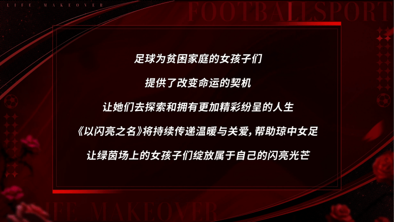 正在承担公益义务和彰显女性力量方面,《以闪亮之名》也可谓行业典型。颁布发表将以“以闪亮之名全体合股人”的表面,向海南琼中女子脚球队供给包罗体育配备、糊口用品正在内的资本搀扶,让她们无后顾之忧地奔驰。从最早的默默做公益,向灾区女性捐帮女性日常用品,再到今天打制了“她期近闪亮-拥抱闪亮的她”系列公益标签,这一的也让人们看到了女性力量的坚韧取伟大。